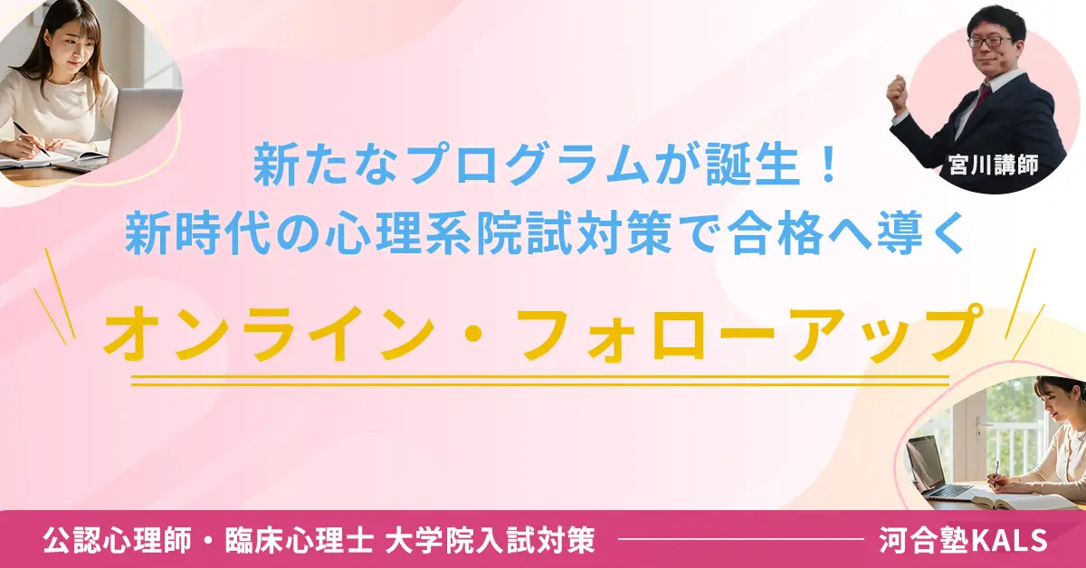 | 参加特典 | 受験校選択に役立つKALSオリジナルの『公認心理師・臨床心理士大学院入試ガイド』をアンケートにご協力いただいた方に無料進呈 |