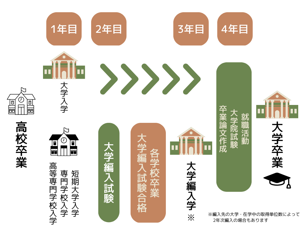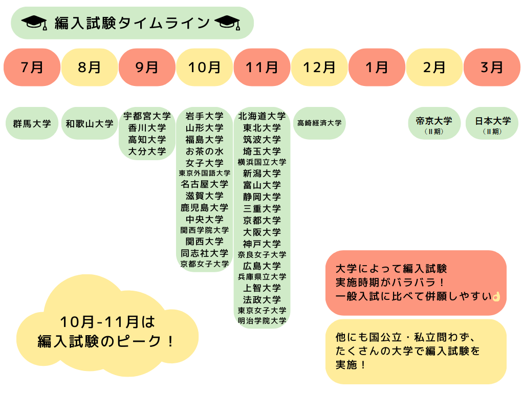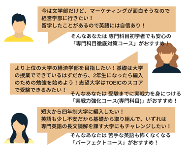 | 開講 | 編入試験実施年度 (編入学目標時期) | コース名 | 基礎・応用 (動画配信) | 文法・長文読解 (通学・動画配信) | TOEIC® (通学・動画配信) | 論述トレーニング (動画配信) | 実戦 (通学・動画配信) | 専門英語 (通学・動画配信) |